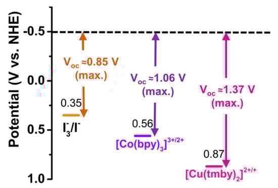 depends on the energy difference between the electrons at the anode and those at the cathode [3]. This is the maximum voltage that the cell can supply to an external circuit, and in a DSSC is primarily dependent on the redox potential of the electrolyte (redox pair) and the Fermi level of the semiconductor layer [4]. In an open circuit, the potential at the cathode is equal to the redox potential of the electrolyte, while the potential at the anode is equal to the Fermi level of the semiconductor (e.g., ). Undesirable reactions between electrons in the anode and the redox couple of the electrolyte can significantly reduce the of the cell. On average, these recombination reactions occur at a much slower rate than the main reaction, but their effects are evident when observed over longer periods of time. This makes it a relevant factor that needs to be limited or eliminated before commercialization [13]. Si-based PVs on the market have an average lifetime of 25 years, which is far beyond what DSSC can offer in its current state [18,19].