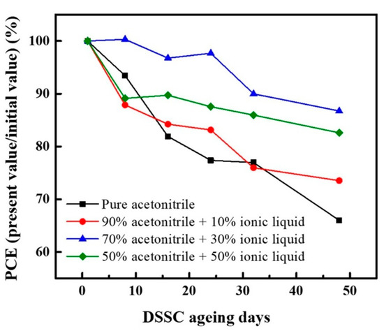 ILs can also be used in combination with an organic solvent or as an additive to an organic solvent [64]. In the form of a mixture or binary solvent, the IL imparts thermal stability to the acetonitrile (or organic solvent), and the low viscosity of the acetonitrile, in turn, allows good charge transport. Tedla et al. compared different proportions of the IL, 1-butyl-3-methylimidazolium bromide (BMIBr), in acetonitrile [60]. It was found that mixtures with more than 30% of IL had a lower PCE value. This could be due to the restricted charge transport that occurs with an increase in viscosity. Aging tests were also carried out over 46 days, which showed that the cells with the binary solvent retained more than 85% of their efficiency (Figure 4), whereas the reference cell, which used only acetonitrile, retained only about 60% of its initial PCE [65]. This conclusion provides a plausible solvent that has both good efficiency and thermal stability.