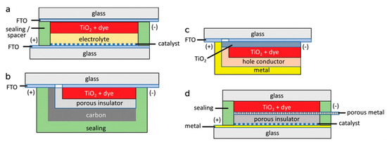 Device structure and components for various proposed DSSC designs: (a) Sandwich cells, (b) monolithic cell with carbon counter electrode, (c) monolithic solid-state cell, (d) conducting glass-free cell. From [4], originally published under a CC BY 3.0 license.