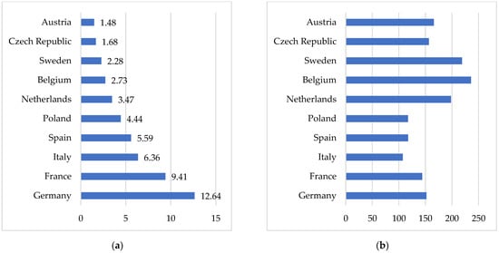 (a) The primary energy consumption of the largest energy consumers in the EU in 2021 (in exajoules); (b) the primary energy consumption of selected EU countries in 2021 (in gigajoules per capita). Source: own elaboration based on the BP Statistical Review of World Energy 1965–2021 [31].