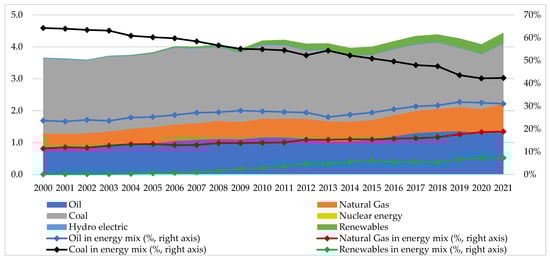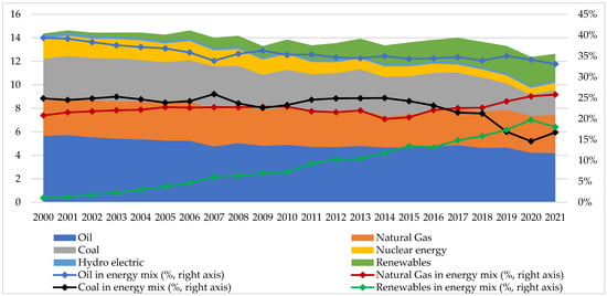 Primary energy consumption structure in Germany during 2000–2021 (in exajoules). Source: own elaboration based on the BP Statistical Review of World Energy 1965–2021 [31].
