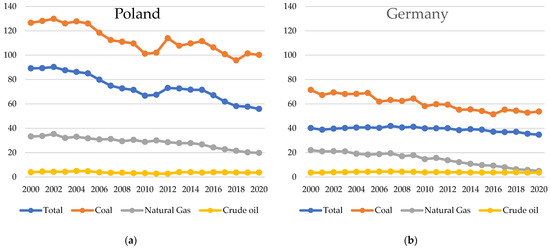 All member states of the EU import energy resources to meet their energy needs, and all are net importers of energy [32]. As a result of the growing demand for fossil fuels, neither Poland nor Germany is self-sufficient enough to cover all their resource requirements (Figure 4).
