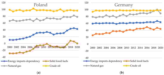 (a) Poland: energy import dependency during 2000–2020 (%); (b) Germany: energy import dependency during 2000–2020 (%). Source: own elaboration based on data from Eurostat [32].