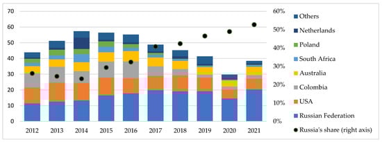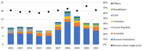 Over the period 2012–2021, Russia provided 66% of Poland’s total hard coal imports (Figure 6). The high reliance on Russian coal is the result of economic reasons, and—due to geological conditions—the coal extraction in Polish domestic mines is more expensive than importing. In 2021, supplies from Russia accounted for almost 66% of the total coal imports, followed by imports from Australia (17%), Colombia (5%), Kazakhstan (4%), Czechia (3%), the USA (3%), and other directions (3%) (Figure 5).
