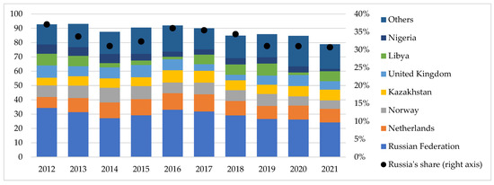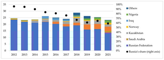 Poland and Germany participate in international energy markets to meet their energy needs. Both countries are entangled in a web of interdependent energy relationships. For many years, the Russian Federation has been the leading supplier of fossil fuels for both countries (Figure 6, Figure 7, Figure 8, Figure 9, Figure 10 and Figure 11). Russia plays a leading role as an energy supplier not only to Poland and Germany, but also to many other members of the EU. According to the official data collected by Eurostat, 49% of hard coal, 26% of crude oil, and 38% of natural gas supplied to the EU in 2020 came from Russia [32].