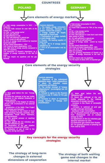 For the above reasons in our research, from among the energy security key areas—energy availability, infrastructure, markets and prices, environment, social aspects, geopolitical aspects, and information [20] (Table 1)—we considered energy availability and geopolitical factors to be the most important in the short period of time during the ongoing energy crisis for Poland and Germany. Poland and Germany as EU members are covered by the European Energy Security Strategy, according to which the grouping’s prosperity and security are supposed to hinge on stable and abundant energy supplies [30].