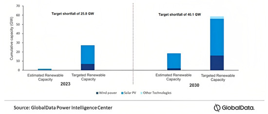 Renewable power capacity, Saudi Arabia. Current forecast vs. target, 2023 and 2030.
