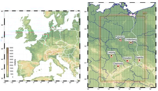 The central and northern parts of the analyzed region (Figure 1) are located within the central European lowlands—Leipzig (central German lowlands), Potsdam, Lindenberg (south Baltic lakes). The southern part is the foothills of the Ore Mountains and the Sudeten Mountains (Dresden, Chemnitz and Goerlitz, respectively). The natural landscapes of the first three locations are denudation plains with moraines, eskers and kames, separated by river valleys of considerable widths and irregular terrain depressions. The next three stations are located at the foothills of the Bohemian Massif (whose north-eastern and north-western fragments are the Sudeten and Ore Mountains [41,42].