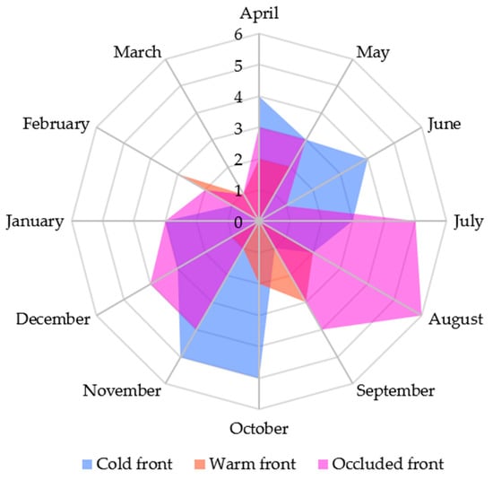 Frequency of atmospheric fronts during the year (April 2021–March 2022) over the study area (12:00 UTC).