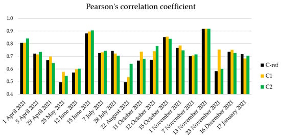 The highest correlation coefficients, equal to or greater than 0.79, were obtained for Leipzig (C-ref: 0.85; C1: 0.84; C2: 0.87) and Chemnitz (C-ref and C1: 0.80; C2: 0.79). The worst values were obtained for the Lindenberg station, which ranged from 0.69 (C-ref) to 0.78 (C2). The largest differences in Pearson’s index values between the different configurations were in the Lindenberg station (0.69–0.78). For the other stations, the differences did not exceed 0.3. The citation shows that the average values for Pearson’s coefficient for the different configurations are similar, although the default configuration (C-ref) has a 0.02 lower value than the others (C1, C2).