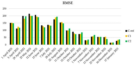 Figure 4 shows that the largest differences in RMSE are in the spring and summer months (29 April 2021, 25 May 2021, 12 June 2021 and 28 July 2021), with values above 15 [W·m−2]. During the autumn–winter season, the RMSE difference value of 15 [W·m−2] was exceeded twice: 12 October 2021 and 23 November 2021. It is clearly visible from Figure 4 that the RMSE values depend on the amount of radiation reaching the Earth’s surface, reaching the highest values in the spring–summer season and the lowest in the autumn–winter season. The exceptions to this rule are the dates of 15 June 2021 and 7 July 2021, when the values of RMSE were much smaller (below 140 [W·m−2]). The average RMSE values, for dates with cold fronts, ranged from 108.5 [W·m−2] (C1) to 110.1 [W·m−2] (C-ref). At the same time, the highest RMSE values were achieved on 25 May 2021 and 12 June 2021 by the C-ref configuration, with values exceeding 200 [W·m−2] (214.6 and 206.5 [W·m−2], respectively). The RMSE values for all dates with moving cold fronts combined were 126.76 [W·m−2] for the default configuration (C-ref), while the values for the other configurations were C1: 123.78 [W·m−2] and C2: 124.31 [W·m−2]. The differences between the minimum RMSE values among the configurations were negligible (not exceeding 0.65 [W·m−2]), while the maximum values for the C1 and C2 configurations were similar (198.81 and 198.95 [W·m−2], respectively), and for C-ref the value was 214.58 [W·m−2].