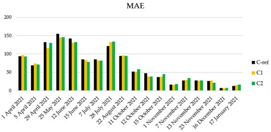 Similarly to the RMSE, the MAE had the highest values during the warm season, exceeding 100 [W·m−2] on 29 April 2021, 25 May 2021, 12 June 2021 and 28 July 2021 (Figure 5). The average MAE values in the autumn–winter season (November to January) reached values nearly four times smaller than those of the spring–summer season (April to August). The MAE values were very similar for the analyzed configurations, for the cool season, ranging from 27.53 [W·m−2] (C1) to 29.35 (C2), while in the warm season they ranged from 106.16 [W·m−2] (C1) to 108.68 [W·m−2] (C-ref). The largest discrepancies between the MAE values (exceeding 10 [W·m−2]), achieved by simulations performed using each configuration, occurred on 29 April 2021 (16.47 [W·m−2]), 12 June 2021 (11.23 [W·m−2]) and 28 July 2021 (12.46 [W·m−2]). While the differences between the minimum MAE values achieved by the different configurations were less than 0.3 [W·m−2], the maximum values exceeded 8.67 [W·m−2] (C-ref: 154.75 [W·m−2] and C1: 145.02 [W·m−2]).