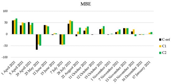 Similarly to the previously analyzed errors, the cold season is characterized by lower values (from 8.77 [W·m−2] (C-ref) to 12.84 [W·m−2] (C2)) relative to the spring–summer season, in which MBE ranged from 12.57 [W·m−2] (C-ref) to 21.53 [W·m−2] (C2). On average, for dates with moving cold fronts, the default configuration had the smallest MBE values (10.67 [W·m−2]), while having the largest differences among the 18 dates analyzed. The absolute difference between the smallest and largest MBE values for C-ref was 126.53 [W·m−2], while for C1 it was 108.49 [W·m−2], and for C2, 117.95 [W·m−2]. It is interesting to note that the default configuration (C-ref) had the lowest minimum MBE value, which was 17.39 [W·m−2] and 22.92 [W·m−2] lower than the results obtained with the configurations, C2 and C1, respectively. The C-ref configuration, on the other hand, was at the same time characterized by the largest discrepancies in accepted values, from −66.95 [W·m−2] to 59.58 [W·m−2], resulting in an absolute difference of 126.53 [W·m−2], which is larger than the C1 configuration by 18.04 [W·m−2] and the C2 by 8.58 [W·m−2]. The chart shows that the largest discrepancies between MBE values obtained through each configuration occur on 22 August 2021 and 23 November 2021. For the default configuration, the MBE values were underestimated seven times, while for the C1 and C2 configurations they were underestimated four times. Hence, it follows that the C1 and C2 configurations are more likely to overestimate the simulation results of the GHI parameter.