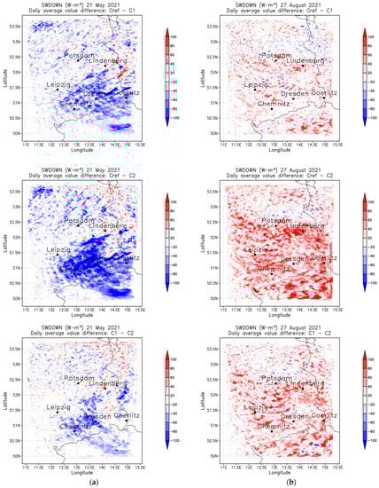 Maps showing average daily differences in SWDOWN values in the analysis area for dates with occluded fronts. For each date, (a) 21 May 2021 and (b) 27 August 2021, the differences between C-ref and C1, C-ref and C2, and C1 and C2, are presented.