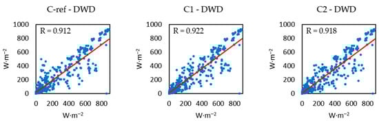 The root mean square error for the analyzed cases is characterized by similar values achieved by simulations carried out for the three configurations (Table 5). The lowest RMSE values were in Leipzig and Chemnitz. In both cases, the average RMSE values (for all configurations) do not exceed 120 [W·m−2]; they are 114.32 [W·m−2] and 119.99 [W·m−2], respectively. In this comparison, Lindenberg was the worst with an average RMSE value of 134.64 [W·m−2]. Considering the RMSE values produced by each station, the best performing configuration was C1, with the smallest (average) value of 123.7 [W·m−2]. However, the differences between the various configurations were not large—the highest value was produced by C-ref (126.41 [W·m−2]).
