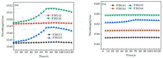 As shown in Figure 2a,b, the abnormal temperature rise point has a corresponding temperature sensitivity of 10 pm/°C and a resolution of 0.1 °C, and the double-clad FBG attached to the surface of the lithium battery case can also monitor the bulging deformation on the surface of the battery case. The longitudinal pressure and strain sensitivity is up to 142 pm/N.