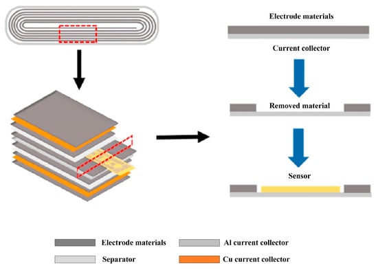In addition to using FBG sensors to measure the internal temperature of the battery, Lee et al. [15] first proposed a miniature flexible thin-film RTD (Resistance Temperature Detector) to monitor the internal temperature of Li-ion batteries in situ. The authors show that the sensor responds quickly, can accurately measure the battery temperature, and is easily mass producible. Flexible thin-film micro-RTDs are based on depositing a 200 nm metal layer on a substrate and monitoring its resistance as a function of temperature. The sensor resistance showed a linear behavior for three consecutive cycles in the temperature range of −20 to 90 °C. However, linearity was not quantified; neither stability over three cycles nor calendar stability was shown, which is very important if these sensors are used inside batteries. The author integrated two miniature thin-film RTDs inside the pouch battery and used thermocouples on the surface of the battery. By comparing the temperature changes inside and outside the battery, it was found that the thin-film RTD sensor responded faster, and the internal temperature of the battery was higher than the surface temperature. Zhu et al. [16] developed a new intercalation method by removing a small portion of the active material on the positive electrode of battery to integrate thin-film RTD sensors. This method can attenuate the influence of the sensor on the capacity loss and damage of the active material. The results of long-term cycling experiments show that, compared with ordinary batteries, the corrosive environment of the battery has no effect on the thin-film sensor, and the battery inserted into the thin-film sensor can maintain good cycling performance. So far, internal temperature measurements for commercial Li-ion batteries have been successfully performed. The thickness of the hot junction of the thin-film thermocouple sensor is mostly on the order of microns, which can accurately measure changes in transient temperature. The experimental method is shown in Figure 3.