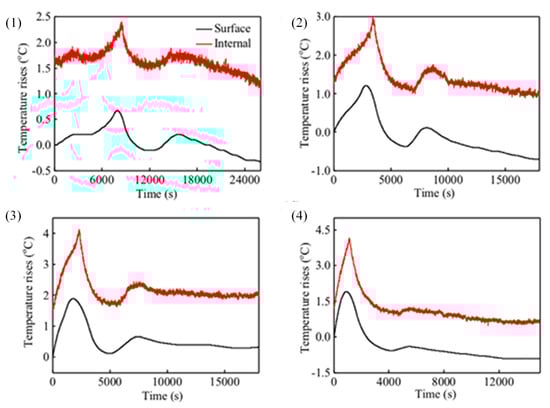 Comparison of internal and surface temperature rise evolution during the discharging and charging processes. (1) 0.5 C, (2) 1 C, (3) 1.5 C, (4) 2 C [26].