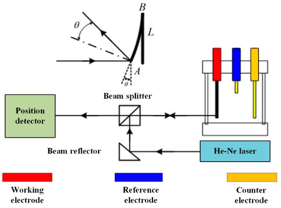 Rosolen et al. [33] used a laser beam detector to study the insertion of Li ions into a membrane electrode and found that the volume change in the non-porous electrode, the surface force, and the presence of a passivation layer in the porous electrode were the main causes of the stress evolution. During electrochemical cycling, Pyun et al. [34] used the laser beam deflection method combined with cyclic voltammetry, the galvanostatic intermittent technique, and the galvanostatic transient technique to observe the growth of membrane LiCoO2 electrodes during lithium ion transport in a three-electrode battery and detect whether stress occurs (which it did). Tavassol et al. [35] immersed Au and Li metal electrode materials in different electrolytes and found that residual tensile stress was observed after delithiation, and its magnitude increased with the increase in the lithiation/delithiation cycle. The results showed that the surface oligomers formed by carbonate solid electrolyte have an effect on the electrode stress evolution. Chung et al. [36] observed the phase transition of LiMn2O4 electrodes using the in situ laser probe beam deflection technique as evidence of the Jahn–Teller effect above 3 V on the surface of thin film electrode particles.