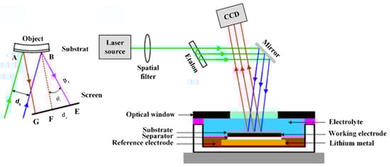 Generally, when the LBPD technology detects the battery pack, mechanical vibration will affect its accuracy. Chason [37] proposed a multi-beam method MOSS (Multi-beam optical stress sensor) based on Stoney theory to obtain film stress. This technology can be used to measure the stress evolution of film objects. If two beams are irradiated at different positions on the substrate or thin film, the distance between them will vary with the change in sample curvature, and the curvature radius is related to this distance. To address this issue, a standard device with highly reflective and parallel surfaces, such as an optical collimator, is used to form a linear array of multiple beams. These multiple beams irradiated on the sample are parallel and have nearly uniform intensity. The corresponding reflected beams are imaged on a CCD detector. This detector converts the optical signals into electrical signals acquired by a computer. The stress accuracy of the sample depends on the beam spacing. Typically, for in situ cathode stress measurement using MOSS, a battery sample consists of a working electrode (cathode), a lithium foil counter electrode, a separator, and an electrolyte. An optical window allows the laser beam to pass through to detect cathode stress changes. The principle of detection is shown in Figure 8.