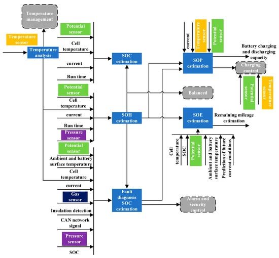 Integrating multiple types of sensors inside and outside the electric vehicle battery [43] can simplify or improve its management and control, thus providing more possibilities for a more practical, safe, and reliable battery management system. The battery sensor fusion application is shown in Figure 9.