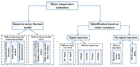 The traditional sensor measurement cannot fully reflect the internal temperature of the motor, while the temperature estimation method without a position sensor realizes the observation of the motor temperature through an algorithm, which has broad application prospects and is more favored by researchers. After nearly two decades of research, the temperature estimation method [69] has only been developed recently. At present, it is mainly divided into two types: the temperature estimation method based on the motor thermal model and the temperature estimation method based on the stator resistance identification. Each method also has several ways of implementation, as shown in Figure 11.