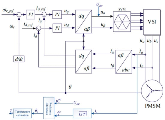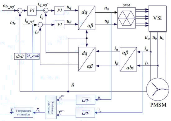 For high-power motors [94], the resistance value of the stator resistance is often extremely small, so the amplitude of the DC component of the voltage generated by the injected DC signal on the phase winding is also very small (relative to the peak value of the phase AC voltage), and the extraction of the DC voltage components is difficult, affecting the accuracy of the resistance identification and temperature estimation results. When a large signal is injected, the amplitude of the output torque ripple increases, which affects the performance of the motor. It is difficult to ensure high temperature estimation accuracy and normal operation of the motor at the same time. Therefore, the above signal injection strategy still needs to be continuously improved to meet the temperature estimation requirements of high-power motors. Compared with DC signal injection technology, AC signal injection technology can also be used for motor temperature estimation. The system control block diagram of the temperature estimation method based on AC current injection technology is shown in Figure 15. In this method, an AC current signal is inputted into the d-axis of the dq coordinate system. Through motor vector control, DC components of voltage and current are generated in the stator windings of the motor. The DC components of the voltage and the DC components of the phase current are sampled separately. The temperature estimation value is obtained based on the formula.