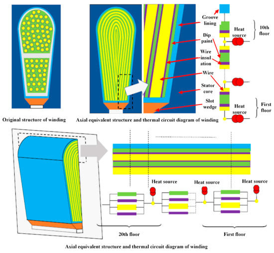 For small and medium size motors, Huang et al. [106] proposed an equivalent winding model and considered the influence of filling factor and void ratio on the temperature rise of the motor to reduce the temperature estimation error. Wallscheid et al. [107] analyzed the advantages and disadvantages of the thermal model method and the signal injection method in detail, and on this basis, proposed the fusion of two methods to improve the accuracy and robustness of temperature estimation, mainly through the Kalman filter. The goal of accurately estimating motor temperature is achieved by combining a lumped parameter thermal network model and a motor model-based temperature observer. The bus current impact and torque ripple caused by signal injection have been studied in depth, respectively. Lu et al. [108] proposed a nonlinear control method to suppress the torque ripple. In addition, Zhang et al. [109] analyzed the magnetic saturation problem caused by DC signal injection in detail, determined the magnetic saturation phenomenon that the injected signal will change during the motor operation cycle, and analyzed the effects of magnetic saturation on the motor current, motor thermal performance, stator winding resistance, and temperature, highlighting that magnetic saturation has no effect on stator resistance and temperature estimation performance and demonstrating the feasibility of implementing the aforementioned active thermal management technique based on motor temperature estimation under different load conditions. Sun Jiayu [110] combined the heat source acquisition model based on the signal injection method with the motor temperature identification model based on the thermal network method, and at the same time, considered the coupling relationship between motor parameters and temperature and finally increased the temperature of the stator winding of the permanent magnet synchronous motor. Figure 16 is a thermal path diagram of the stator winding in the axial direction. The stator winding is divided into 20 layers in equal proportions, with each layer consisting of wire, wire insulation, and impregnation in parallel. Finally, the winding is equivalent to a radial × axial arrangement, with 10 × 20 units, and the heat sources are evenly distributed among each unit. The considerations for the end-winding are the same as those for the winding inside the slots. The newly constructed stator winding model remains in the same position in the thermal network model, and the corresponding components connected to it are also discretized accordingly. The degree of discretization decreases gradually with the distance from the stator winding.