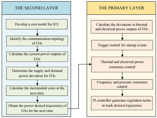 A hierarchical control framework of electrical and thermal hybrid energy systems is proposed to minimize the generation cost of IES and ensure EHs stable operation. The hierarchical control includes two objectives: the desired trajectories of electric and thermal power outputs are calculated in the second layer, and the tracking of desired trajectories is obtained in the primary layer. Once the optimal solutions of the cost functions are achieved in the second-layer, they are adopted as desired trajectories of EH power outputs and fed into the event-triggered consensus controller to realize the global stable operation objective.