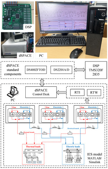 To verify the effectiveness of the distributed consensus hierarchical optimization and control method based on an event-triggered mechanism, a hardware-in-the-loop (HIL) experiment based on dSPACE was conducted. The performance of the proposed method was tested in a IES that includes three EHs. An electrical network and a thermal network were connected to all EHs, as shown in Figure 1. The structure of the HIL experimental platform is shown in Figure 3. The IES model was realized in MATLAB/Simulink. The hardware codes of the IES model could be automatically downloaded from MATLAB/Simulink to Control Desk of dSPACE by real-time workshop (RTW) and real-time interface (RTI). The DSP TMS320F28335 high-speed processor was adopted as the controller of the proposed method. The IES operation information was sampled from Control Desk to DSP by the DS4002 component of dSPACE. The control signals of electrical and thermal energy systems generated by DSP were transferred to the Control Desk by the DS2201 component of dSPACE. The closed control loop was formed with the Control Desk of dSPACE and DSP. The experimental parameters for IES with combined electrical and thermal energy are presented in Table 1 [20].