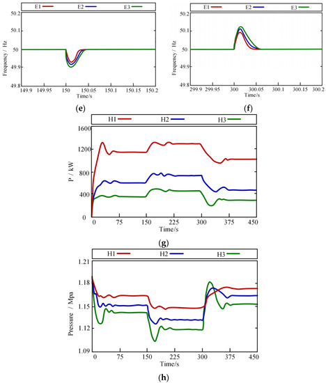 Due to changes in electrical load demand, frequency adjusts with electrical power output mutation. From Figure 4d–f, it is shown that after a short adjustment, the frequency deviations caused by electrical power output fluctuations of the EHs are quickly suppressed and regulated to the rated value of 50 Hz. Due to changes in thermal load demand, pressure also adjusts with thermal power output mutation. From Figure 4h, it is shown that pressures in the thermal branches are controlled within the allowed range and the proposed distributed consensus control method ensures a safe and stable operation of IES.