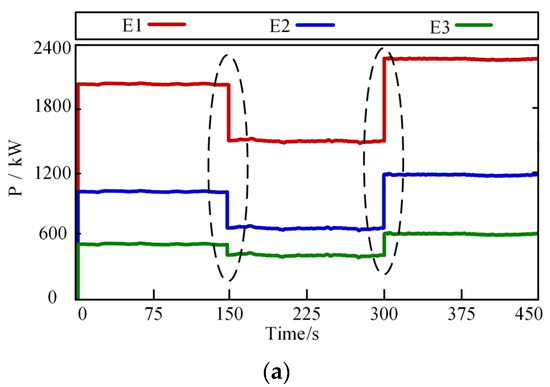 At t = 150 s, the IES experiment is set to simulate a decrease of 1000 kW in the electrical load and an increase of 500 kW in the thermal load. At t = 300 s, an increase of 500 kW in the electrical load and a decrease of 300 kW in the thermal load follow. The dynamic response results of electrical and thermal networks are shown in Figure 5.
