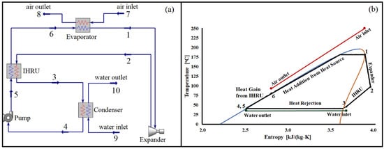 To further illustrate the cycle’s operation, Figure 1b presents a temperature-entropy diagram at a specific source temperature. The expander generates power output as the working fluid expands between state points 1 and 2. Notably, the temperature of the fluid at state 2 is significantly higher than the ambient temperature. Without the implementation of the IHRU, the heat from the stream leaving the expander would be lost. However, by utilizing the IHRU, the heat from the stream between state points 2 and 3 is effectively recovered, leading to an increase in the working fluid’s temperature between state points 5 and 6. Finally, the stream between state points 6 and 1 receives heat from the source (hot air) to reach the desired operating temperature of the cycle.