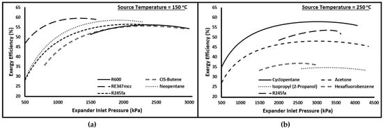 Exergy efficiency versus Expander inlet pressure for (a) R600, CIS-Butene, RE347mcc, Neopentane, and R245fa at source temperature of 150 °C and (b) Cyclopentane, Acetone, Isopropyl (2-Propanol), Hexafluorobenzene, and R245fa at source temperature of 250 °C.