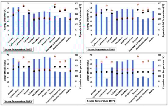 Figure 3 presents the plots of exergy efficiencies at source temperatures 300, 250, 200, and 150 °C. The expander inlet temperatures (black dots) are also plotted along with the critical temperature (red diamonds) of the fluid. This plot shows a very interesting feature between how the exergy efficiency varies with increasing source temperature in relation to the expander inlet temperature and critical temperature. For example, considering pentane at a source temperature of 150 °C, the exergy efficiency is 61.7% and the difference between its critical temperature and expander inlet temperature is nearly 57 °C (distance between red diamond symbol and black dot). Increasing the source temperature from 150 to 200 °C improves the exergy efficiency but it reduces the distance between the red diamond symbol and black dot. The improvement in exergy efficiency continues till the difference between the critical temperature of the fluid and expander inlet temperature continue to drop; thereafter, further increases in source temperature negatively impact the exergetic performance of the cycle. This behavior is similar for all organic fluids. Like, for n-Butane, CIS-Butene, RE347mcc, Neopentane, and R245fa, increasing the source temperature beyond 200 °C reduces the exergy efficiency.