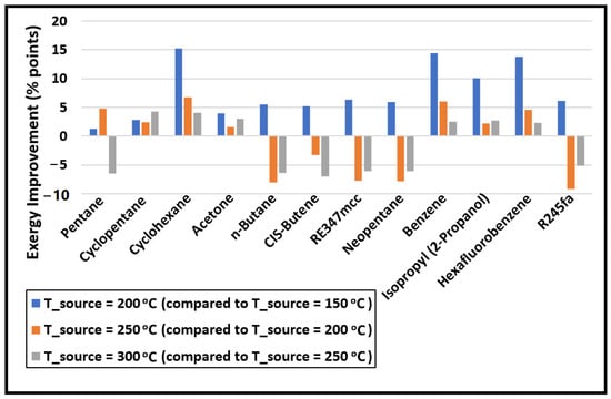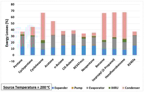 The change in the exergy efficiency (in percentage points) between each source temperature is calculated and plotted in Figure 4. A big improvement in the exergy efficiency (nearly 15% points) is noticed when the source temperature is increased from 150 to 200 °C for cyclohexane, benzene, isopropyl alcohol, and hexafluorobenzene. However, these four are the least-performing organic fluids in comparison to others at all source temperatures, as seen in Figure 3. One of the reasons for their poor performance is their normal boiling temperatures, which are significantly higher compared to the minimum temperature of the organic fluid in the cycle (i.e., 40 °C). Therefore, the working fluid cannot expand to the saturation pressure corresponding to 40 °C in the expander as the minimum pressure the fluid can expand to is 101 kPa to avoid a vacuum in the system. As a result, a substantially large portion of the exergy loss incurs in the condenser for cyclohexane, benzene, isopropyl alcohol, and hexafluorobenzene, as evident from Figure 5. This figure shows the exergy losses incur in each component of the cycle.