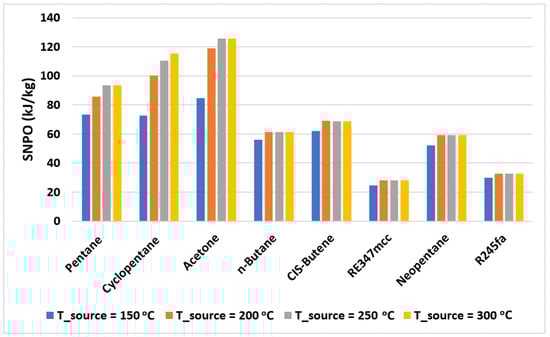 where is the mass flow rate of the working fluid in the cycle. Figure 6 shows the values of SNPO plotted for various organic fluids used. Based on Table 3, cyclohexane, benzene isopropyl alcohol, and hexafluorobenzene are not considered due to their poor exergy performance. Figure 6 shows the values of SNPO plotted for the organic fluids with exergy efficiency above 50%. It is evident from this figure that RE347mcc and R245fa provide the least specific net power output (nearly 30 kJ/kg on average); therefore, for a given power net output, a higher mass flow rate is needed for RE347mcc and R245fa in comparison to other organic fluids. Increasing the mass flow rate requirements may lead to the increase in size of the turbomachinery (expander and pump) and the heat exchangers. Acetone presents the highest SNPO, but its exergy performance is significantly low in comparison to the rest. On the other hand, pentane being highly efficient also provides reasonably good SNPO at all source temperatures (from 75 to 95 kJ/kg). n-butane, CIS-butene, and neopentane behave nearly similarly giving out SNPO of nearly 60 kJ/kg.