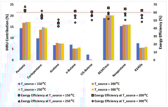 Figure 7 presents the IHRU contribution in the cycle calculated using Equation (10); symbols plotted in this figure represent the exergy efficiencies of the cycle at various source temperatures. It is observed that the IHRU role is significantly higher in recuperating heat from the cycle when operating with pentane, cyclopentane, RE347mcc, and neopentane. Pentane was found to be highly efficient (with exergy efficiency above 60%) at all source temperatures. It showed the highest exergy efficiency of 67.7% at a source temperature of 250 °C for which the IHRU contribution is nearly 17%. Acetone is the least efficient and needs a heat recuperation cycle with a contribution of the IHRU of nearly 7.5%; this means its performance would further decline if a simple Rankine cycle were used instead of a heat recuperation cycle. The cycle operating with CIS-butene doesn’t need the IHRU as it shows nearly no contribution in recovering the heat. This means that the CIS-butene would perform better in comparison to other organic fluids if the simple (standard) Rankine cycle is used n-butane, R245fa offers exergy efficiency of nearly 62% at a source temperature of 200 °C with an IHRU contribution of nearly 5%; this implies that in comparison to pentane, cyclopentane, RE347mcc, and neopentane, these two organic fluids would perform better if a simple Rankine cycle were used.