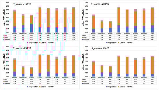 where , , and represent the conductance of the evaporator, condenser, and IHRU, respectively. It is worth recalling that the mass flow rate of the organic fluid in the cycle is not equal for each case. Only the mass flow rate of the heating medium (i.e., hot air) is taken constant, which is 1 kg/s; therefore, to compare the size of the system, the net conductance () of the system for each case is normalized by the net power output of the cycle.