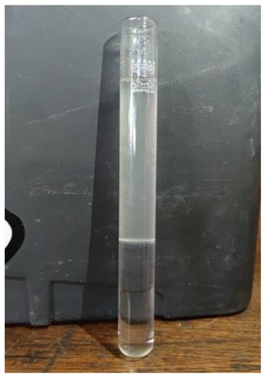The typical methodology of pine sap extraction can be found in [23,24]. Pine sap is usually added to a distillation flask together with a quantity of distilled water; considering that the high viscosity of this sap depends on its temperature, it is necessary to add a part of water. After the mixture is exposed to a heat source, the mixture homogenises, and the sap from the trees changes its viscosity and colour, becoming a liquid. Depending on the intensity of the heat source and the amount added to the flask, the duration until the mixture reaches its boiling point is approximately 15 min. As the mixture boils, the content in the flask decreases. This is due to the decrease in the level of water content in the mixture; therefore, a quantity of water is gradually added to extract as much of the substance as possible. Water vapour and turpentine vapour are condensed to reach a liquid state, and they drain into a container. The newly formed mixture is left to settle for 24 h; due to the different density of turpentine compared to water, it separates from the water and can be collected. In general, it is commonly observed that the majority of fuels that are derived through the process of steam distillation and have not undergone transesterification are regarded as fuels characterised by their low viscosity and a lower cetane number [25,26]. In the present study, the authors only performed the blending and some tests to check the solubility of turpentine in diesel and in water. Figure 2 illustrates the decantation process of water that was purposefully added by the authors to turpentine in a test tube to confirm the full phase separation of the fuel and water.