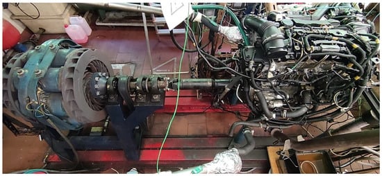 The engine (Figure 3) in which the fuels were tested was a 1.6 L PSA HDI four-cylinder, four-stroke, water-cooled, turbocharged diesel engine with an intercooler in the intake manifold. The only changes made to the engine were related to the turbocharger pressure and the EGR, which was deactivated. These changes were carried out to avoid an excessive number of parameters being varied at the same time, which would have made it impossible to suitably analyse the effect of fuel blends on the behaviour of the engine. Namely, the turbocharger pressure was set at a fixed value throughout the speed range in order to have the same boost pressure (0.5 bar) for all tests independently of the speeds and loads tested. A similar statement may be made regarding the EGR levels. Although these alterations somewhat limited the scope of the results obtained, they allowed a more objective assessment of the impact of turpentine blending for the different test conditions. The original ECU was used, but it was reprogrammed to eliminate errors associated with using the engine outside of the vehicle and also to deal with the changes made to the engine, as mentioned above. A rotary encoder measuring both 1 and 2500 pulses per revolution was used on the electromechanical brake shaft to monitor its speed. The brake controller varied the braking torque so that it kept the engine speed within ±5 rpm of the setpoint. The engine was equipped with a high-pressure fuel pump and a common rail fuel system. The injection command was carried out electronically through the electronic control unit (ECU). A high-pressure sensor inserted into the common rail was responsible for monitoring the fuel pressure. To facilitate the analysis of the engine behaviour, the EGR was not active.