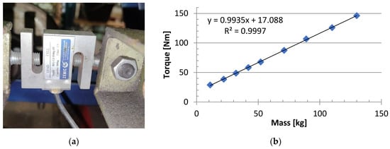 (a) S-type torque cell and (b) calibration curve, with calibration points in blue.