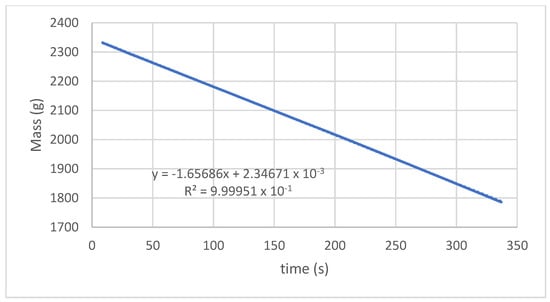 Example of the evolution of fuel mass in the tank over time to enable calculation of consumption including linear regression fit, in which the slope is the resulting mass flow rate of fuel.