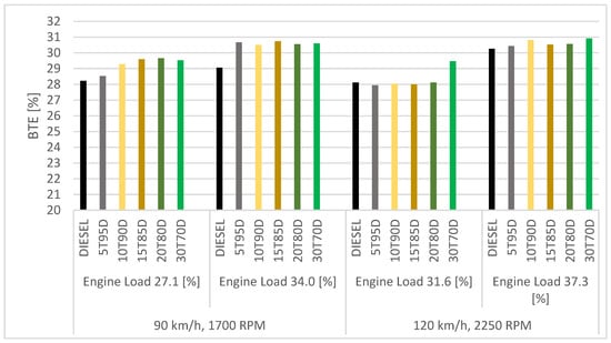 The BTE (in %) of the engine for the different concentrations of mixtures of biofuel with diesel is presented in Figure 7. As can be seen, the turpentine addition always had a positive effect relative to diesel except for at the high-speed, low-load setting, at which the improvement was only visible for the highest level of turpentine incorporation.