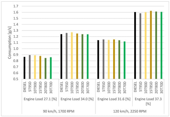 Fuel consumption (g/s) of the engine for different fuel blends.