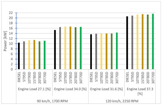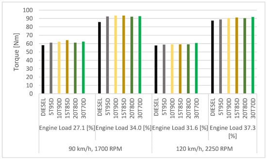 Torque and power are parameters that are important in assessing vehicle performance. Often, authors either report results on turpentine blends for a full engine load [21] or as a function of several engine loads. However, not only is a full engine load an engine setting that is rarely used in regular driving but also many studies do not even highlight the torque/power corresponding to a given engine load. This makes it difficult to assess the usefulness of the results for real driving scenarios.