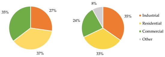 Electricity consumption by sector in (left–right) the United States of America [17] and New Zealand [16]. Note the 8% ‘Other’ category is consumed in the agriculture and transport sectors, sectors that are not considered in this work.
