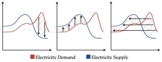 Illustration of Demand Response to match electricity supply by (left–right) peak shaving, valley filling, and load shifting. The black arrows indicate the effect of Demand Response on the original electricity demand.