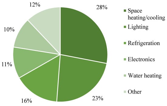 Figure 4 shows the overall end use pattern for electricity use, yet this is likely to change depending on the type of premise. A high share of electricity use for space conditioning (25–30%) is characteristic in office, service, and wholesale trade buildings. However, retail buildings are characterized by having a predominant share of electricity use for refrigeration (35–40%) [104].