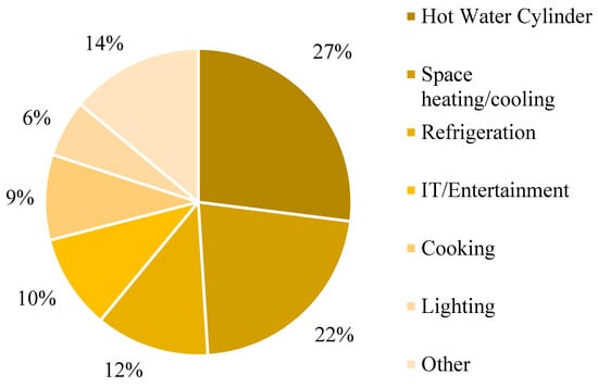 Electricity is used in the residential sector for a number of applications, including cooking, lighting, and heating. Figure 5 shows a breakdown of energy consumption by end use in the residential sector in New Zealand, where residential electricity consumption comprises 33% of the national total.